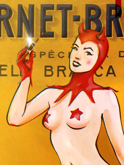 Step into the sultry world of classic cocktail culture with Bartender’s Handshake, a bold illustration inspired by vintage Fernet Branca advertisements. This piece reimagines the aesthetic of retro liquor ads with a provocative twist: our devilish pin up confidently holds a shot of Fernet. Behind her, typography mirrors the iconic style of classic Fernet ads, blending nostalgia with modern flair.