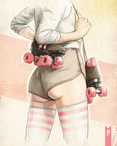 Fast, fierce, and a little flirtatious - Derby Daze captures the unapologetic energy of roller derby culture with a pin-up twist. The illustration features a derby girl confidently holding her skates over her shoulder, thigh-highs framing her strong legs, and her juicy curves adding undeniable allure.