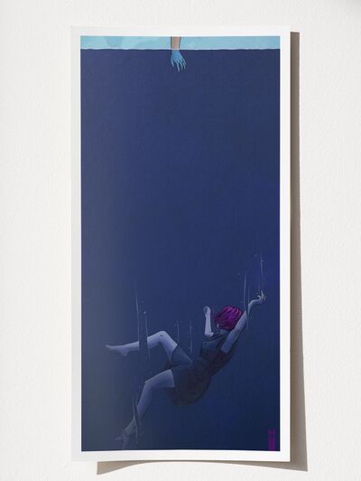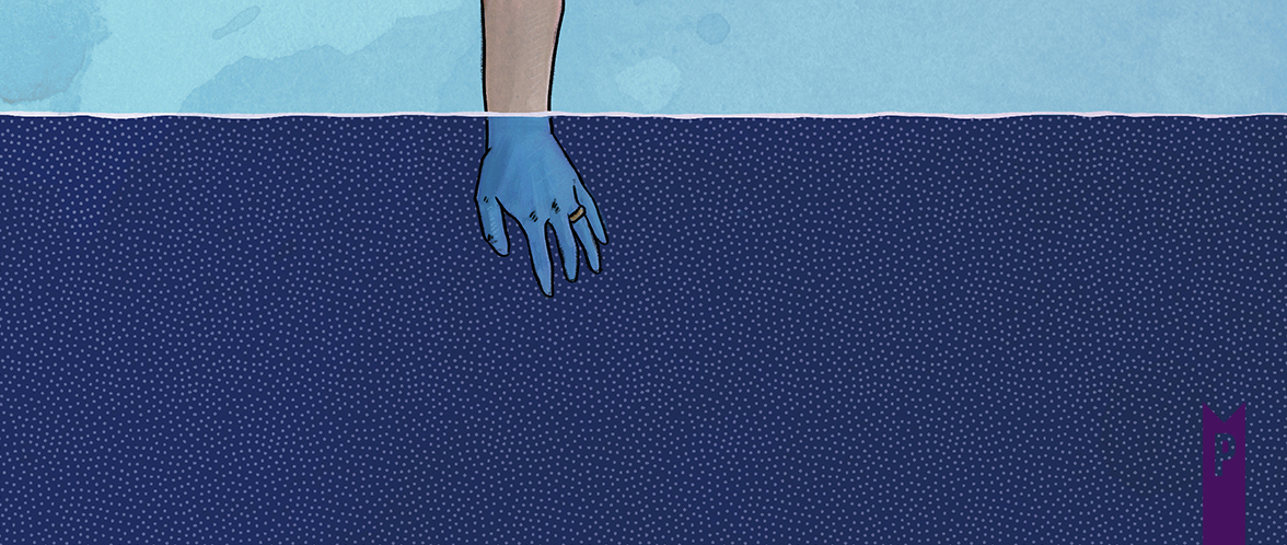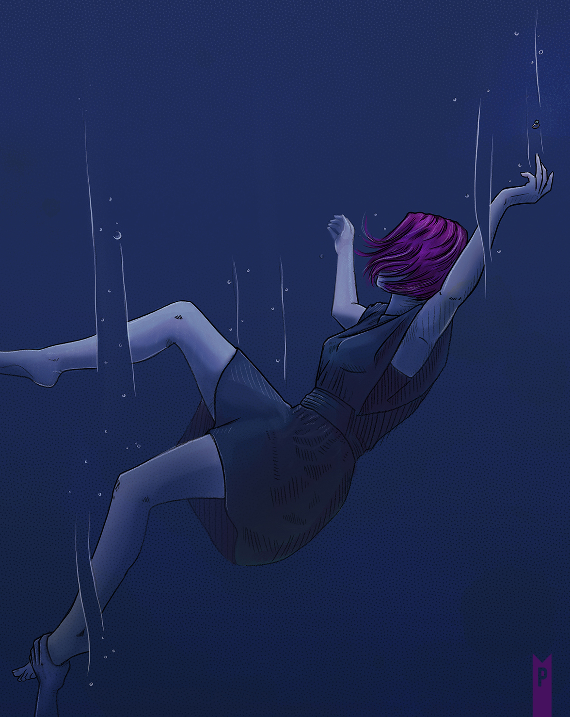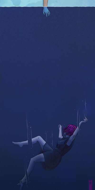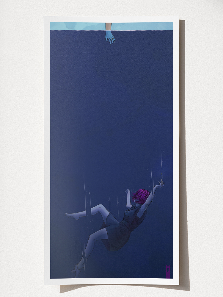 In Too Deep is an intimate, visceral response to betrayal and loss, born from the artist’s personal experience with infidelity. The illustration depicts a woman submerged underwater, her hair veiling her face, her body suspended in the current as her wedding ring slips from her finger. A man’s hand grips her foot, dragging her further below, while another hand - bearing a wedding ring - reaches down from the surface above. Yet she is already too deep, caught in the pull of despair and divided loyalties.