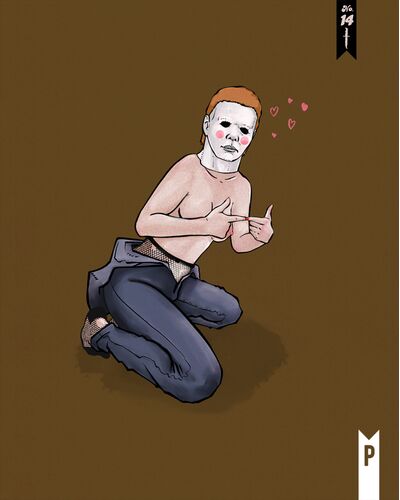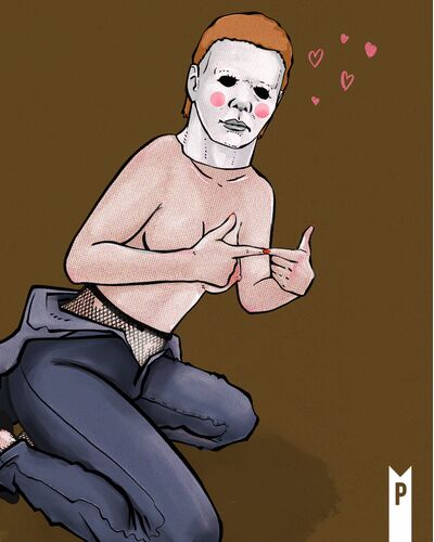 The boogeyman has never looked this bashful. I've reimagined the slasher icon of Halloween as a retro-style pin-up girl, complete with vintage glam curves and that unmistakable white mask. Striking a coy pose with her fingertips pressed together in true “UwU” fashion, this playful mash-up blends spooky horror with cheeky kawaii charm.