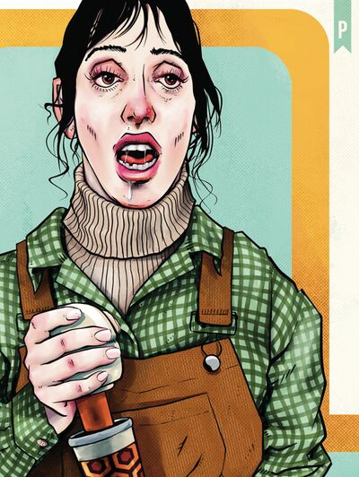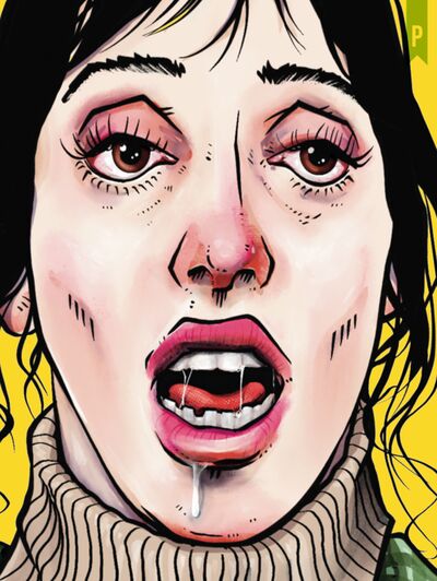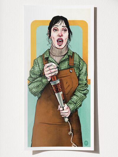 Behind Wendy, the eerie, mint-hued wall pattern of Room 237 adds another homage to the film, grounding the piece in Kubrick’s unforgettable world while bending it toward parody and pop-art provocation.