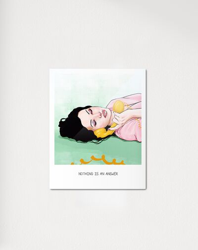 This print, titled “Nothing Is an Answer”, depicts a scene of a girl stretched across the floor, phone in hand, mid-conversation with someone who may never pick up. The caption underscores the mood with quiet defiance and ambiguity - turning a simple snapshot into a statement about silence, longing, and long distance.