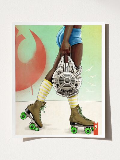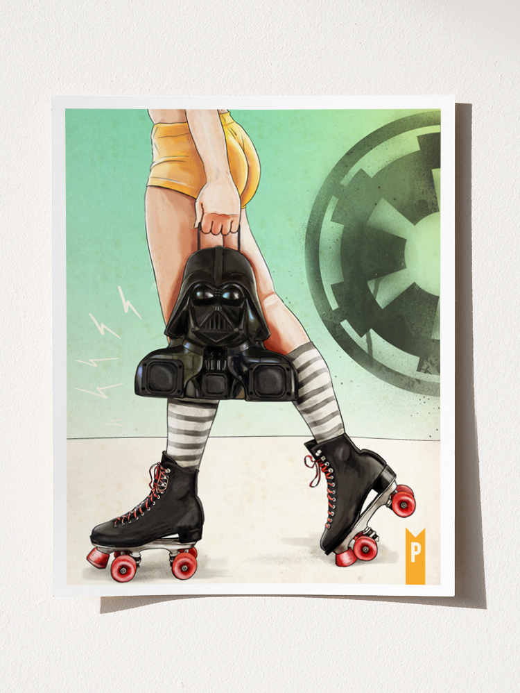 When the galaxy collides with the roller rink, you get Skate Wars. This two-print set features a pair of fierce roller derby girls, each blasting their own marches with custom boomboxes built from Star Wars icons - the Darth Vader action figure case and the classic Millennium Falcon toy.