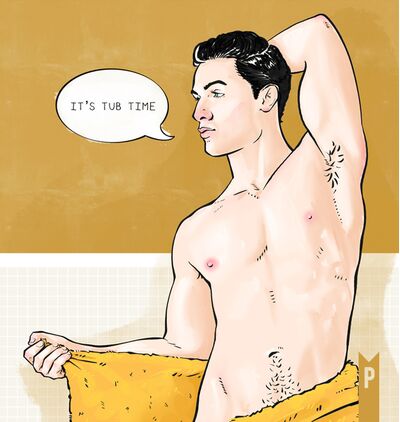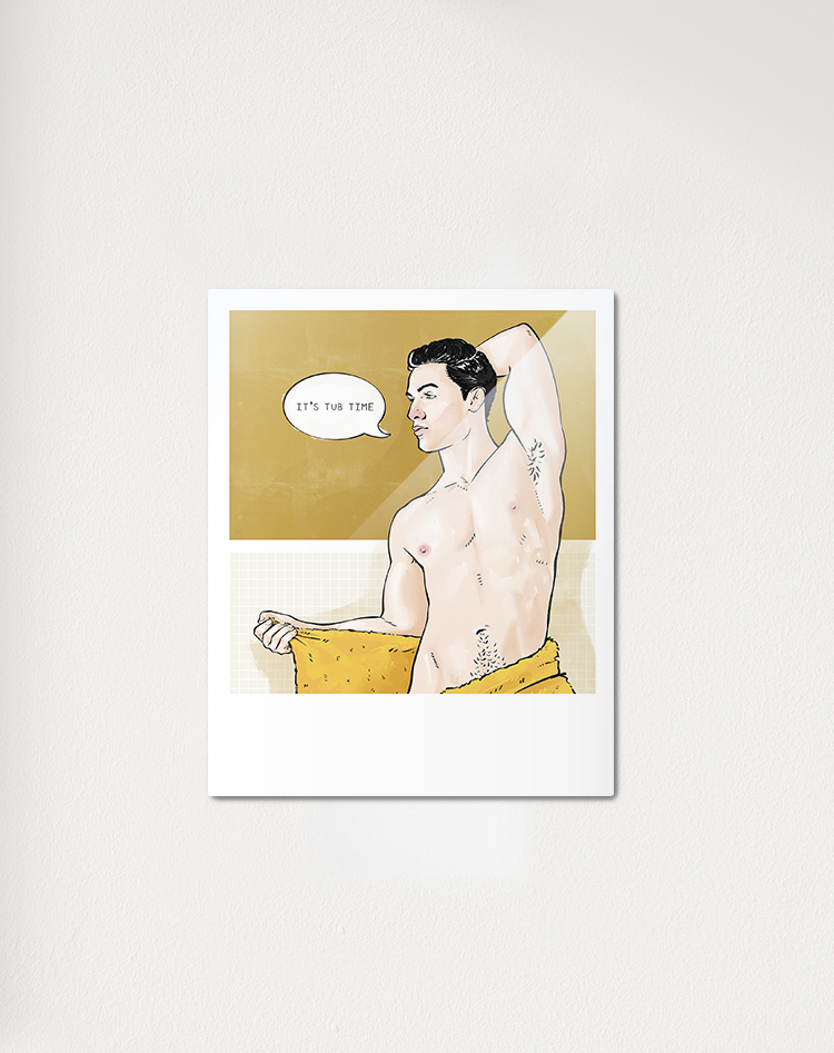 This print, titled “Tub Time”, features a sultry male pin-up lounging in nothing but a towel - the caption beneath the image captures the instant-photo aesthetic while turning up the heat.
