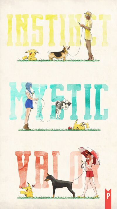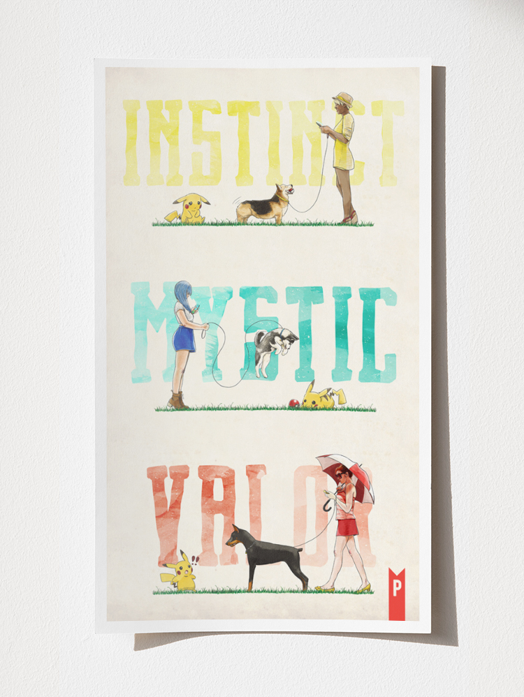 Adventure meets companionship in Who Wants to Pokémon Go for a Walk? This playful artwork brings the three Pokémon teams - Mystic, Instinct, and Valor - into everyday life with a charming twist. Each trainer is depicted strolling with phone in hand, joined by a loyal dog whose personality reflects the spirit of their team: