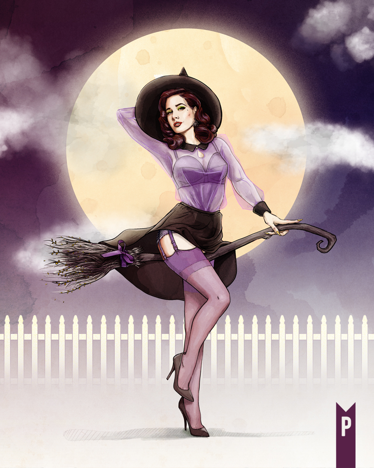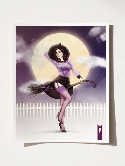 Rendered with rich detail and vibrant color, this piece brings together glamour, fantasy, and nostalgia in one irresistible print. Perfect for fans of classic pin-up art, burlesque enthusiasts, or anyone who loves their witches with a little extra sparkle.