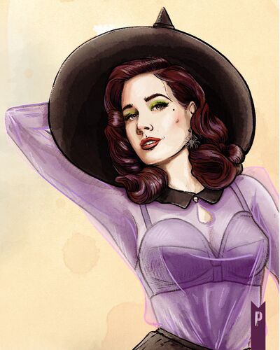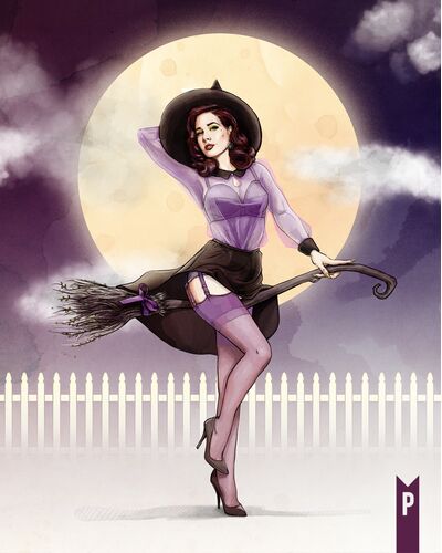 Glamour takes flight in Witch and Famous. This enchanting artwork reimagines burlesque icon Dita Von Teese as a vintage pin-up witch - sultry, stylish, and spellbinding. Perched gracefully on her broom, she channels old-Hollywood allure with a dash of Halloween magic; a perfect fusion of retro pin-up charm and timeless witchy mystique.